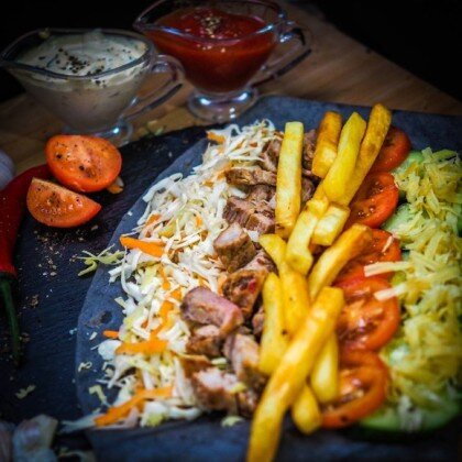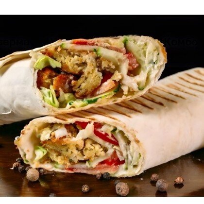 Сочная вегетарианская шаверма с хрустящим картофелем фри. Внутри — свежая капуста, огурцы, томаты и сыр, заправленные фирменным соусом. Блюдо сочетает хрустящую текстуру и насыщенный вкус.
