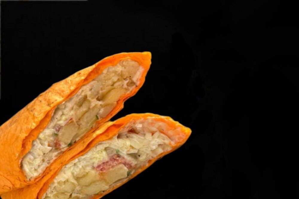 шаверма с хрустящим картофелем фри. Внутри — свежая капуста, огурцы, томаты и сыр, заправленные фирменным соусом. Блюдо сочетает хрустящую текстуру и насыщенный вкус.