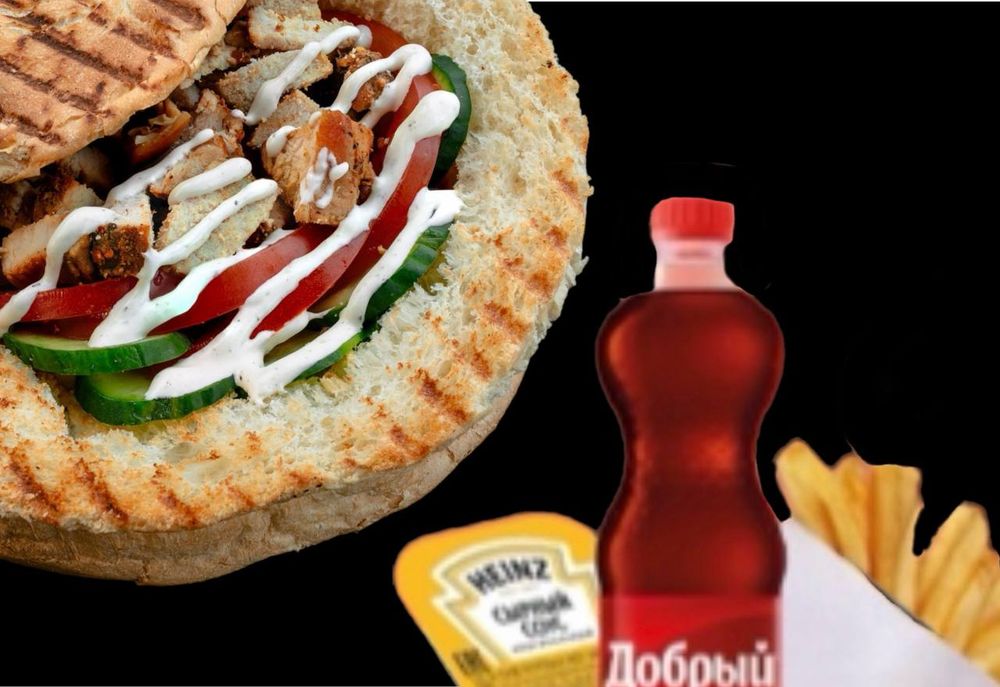 Донер с курицей, картофель фри ,напиток добрый 0.5 на выбор, порционный соус на выбор