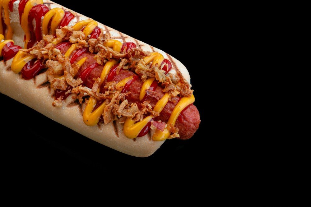 Свежая булка, маринованный лук, маринованный огурчик, сосиска обжаренная на гриле, соусы и лук фри. Отличный вкус в компактном формате